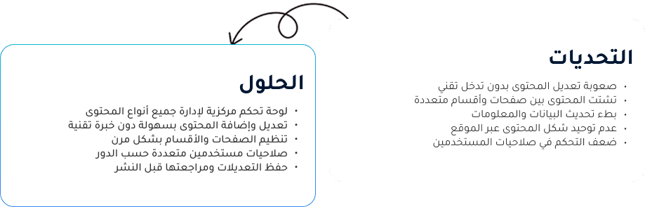 يمكنك من التحكم في محتوى الموقع أو التطبيق بسهولة، تنظيم الصفحات والأقسام، وتحديث البيانات بشكل لحظي، مما يضمن مرونة أعلى، تقليل الاعتماد على المطورين، وسرعة في تنفيذ التعديلات.