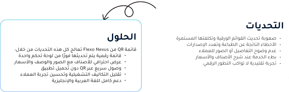 بعد التحول إلى قائمة QR، أصبحت إدارة القائمة أكثر مرونة وسرعة، حيث يتم تحديث الأصناف والأسعار فورًا من لوحة تحكم واحدة، مع عرض احترافي للصور والوصف.