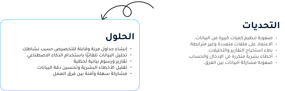 أنشئ ونظّم وحلّل بياناتك باستخدام جداول بيانات ذكية وقابلة للتخصيص، مصممة لمساعدتك على متابعة الأداء، تحليل الأرقام، واتخاذ قرارات دقيقة بسرعة وسهولة.